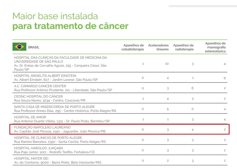 O Hospital Napoleão Laureano, instalado em João Pessoa, na Paraíba, foi citado, em 2025, no ranking internacional ‘Hospirank’ dentre as dez unidades hospitalares com “maior base instalada para tratamento de câncer” no Brasil.